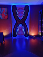 The red room is mostly intended for impact play, shibari and play with the Sybian. Used furniture are Wall Rack, Gallret, Kors-1, Dromedar and Multix, with some rebar mesh and a glass cupboard from IKEA.
