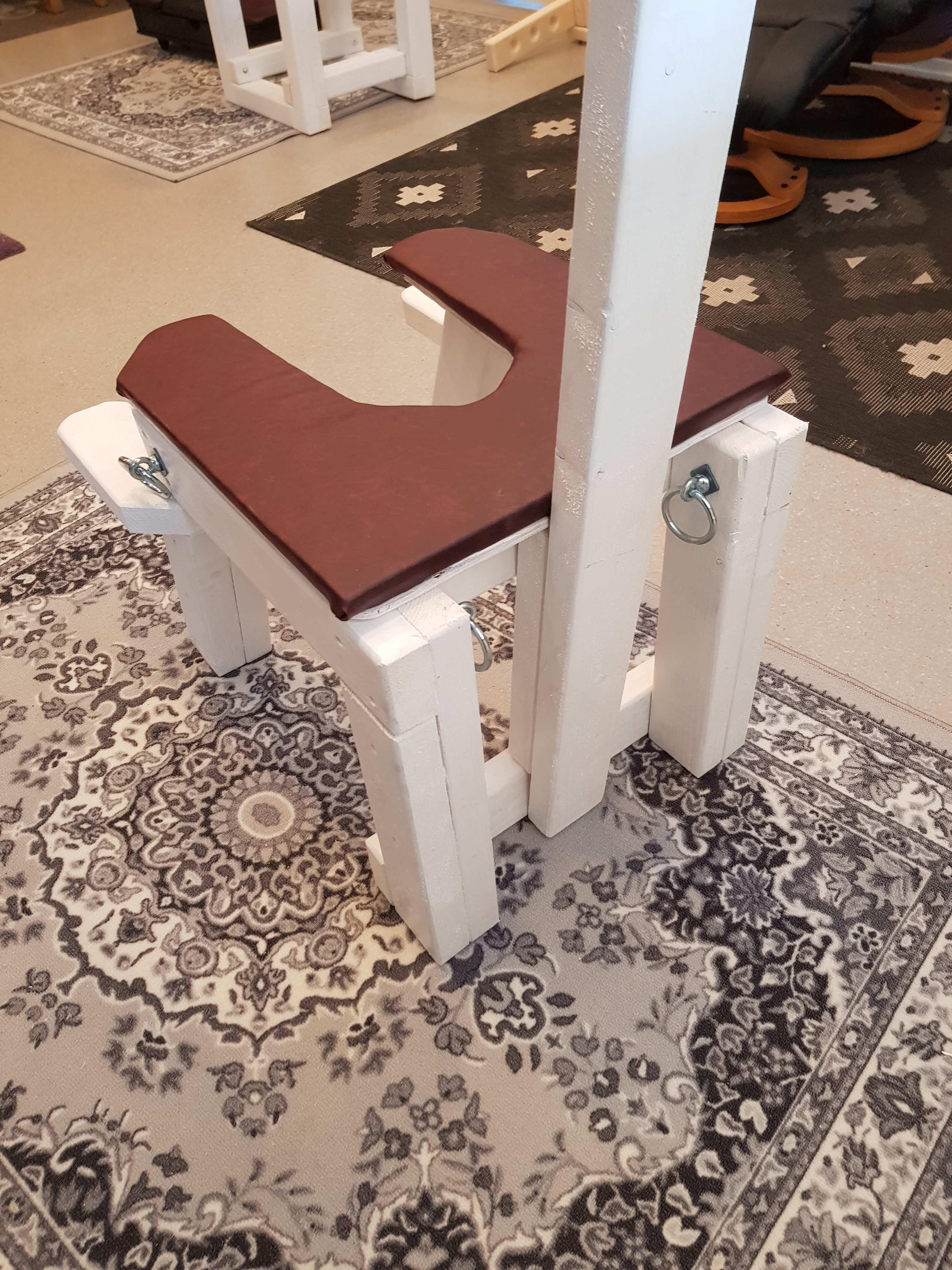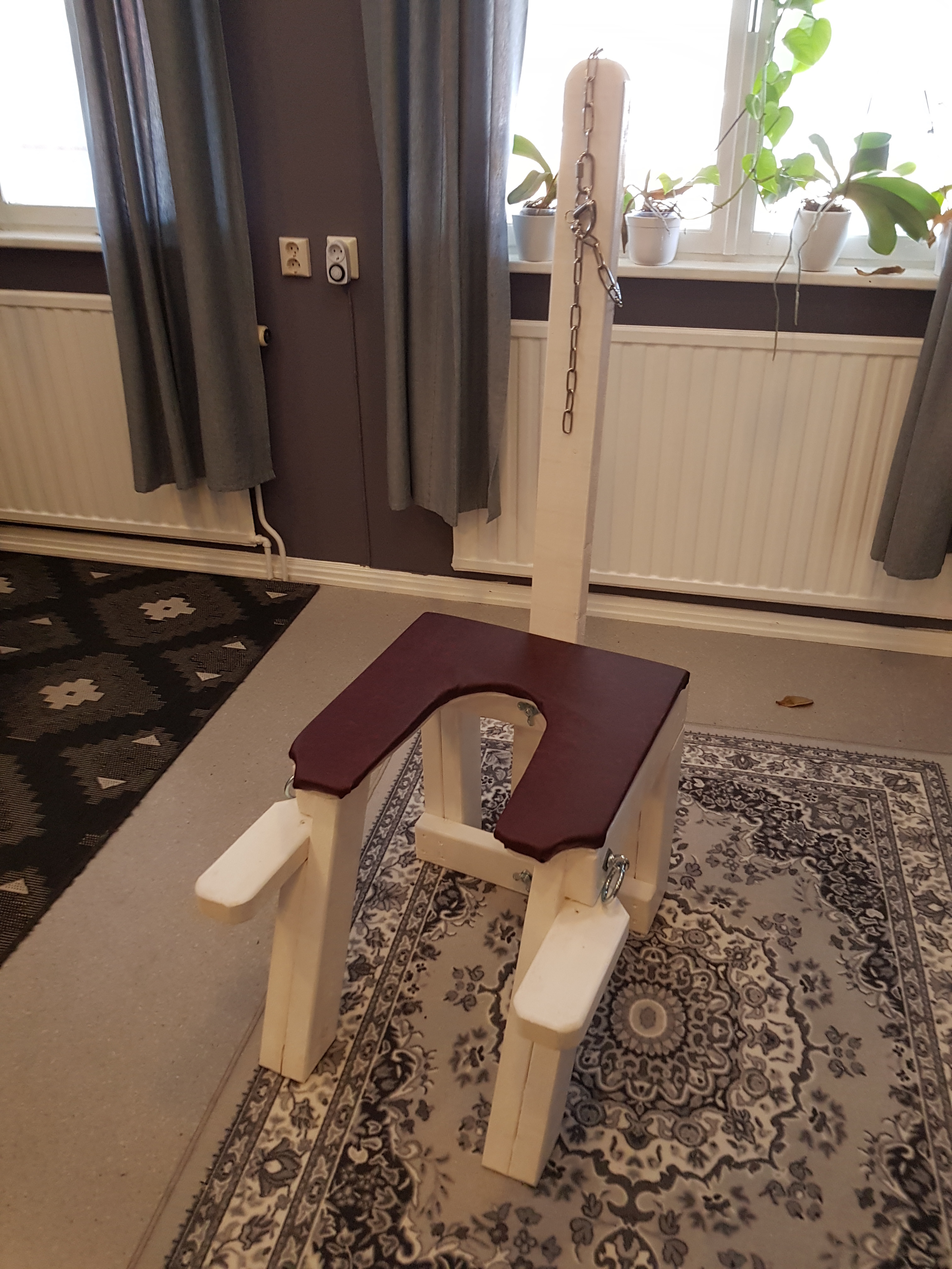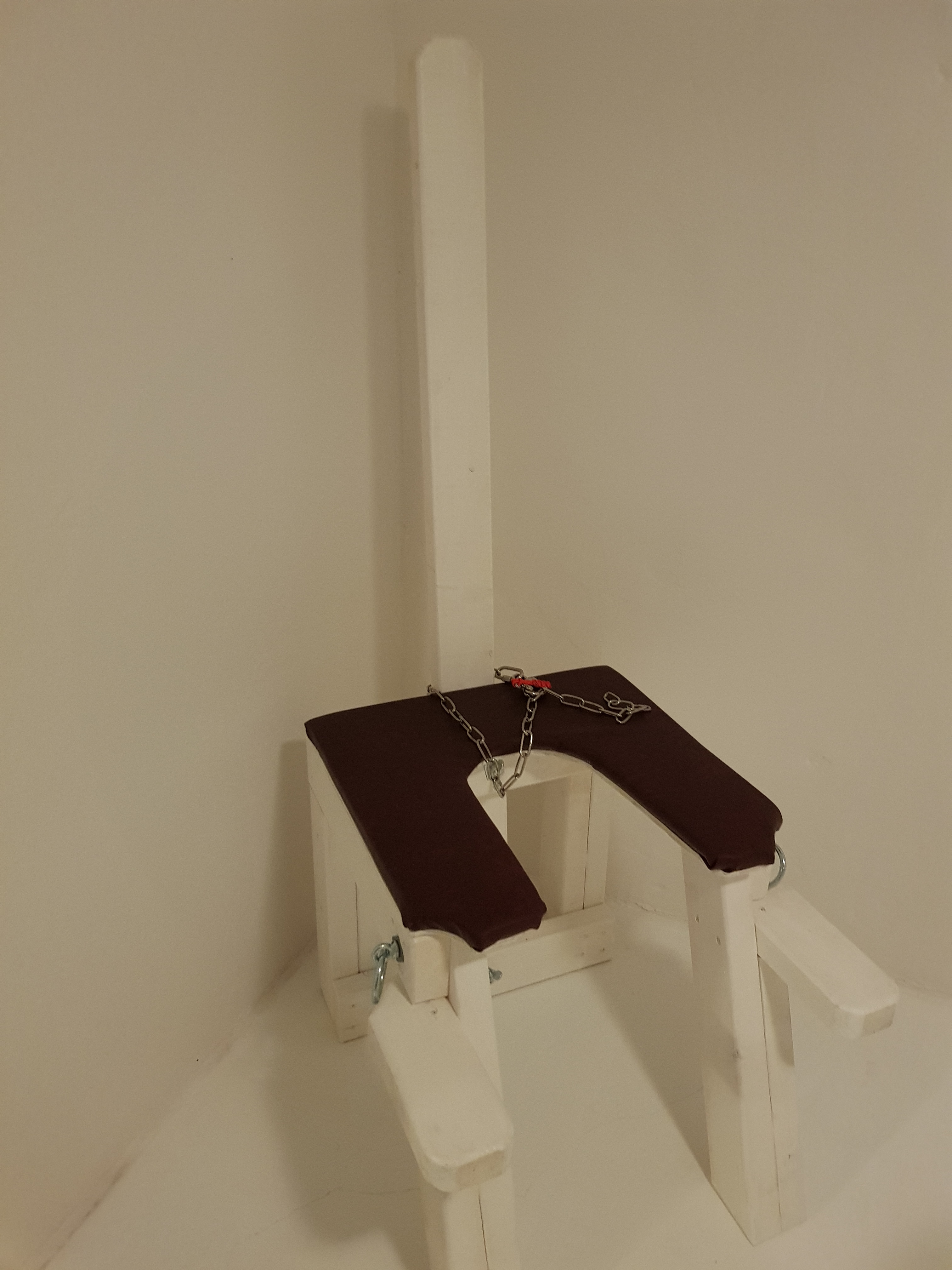 The person sits on the chair, with the feet on the foot rests, ankles locked to the rings. The hands are locked to the rings on the back, and the chain is locked around the neck and back rest. If you don't want the cahin to be around the neck, a longer chain under the arms works as well.