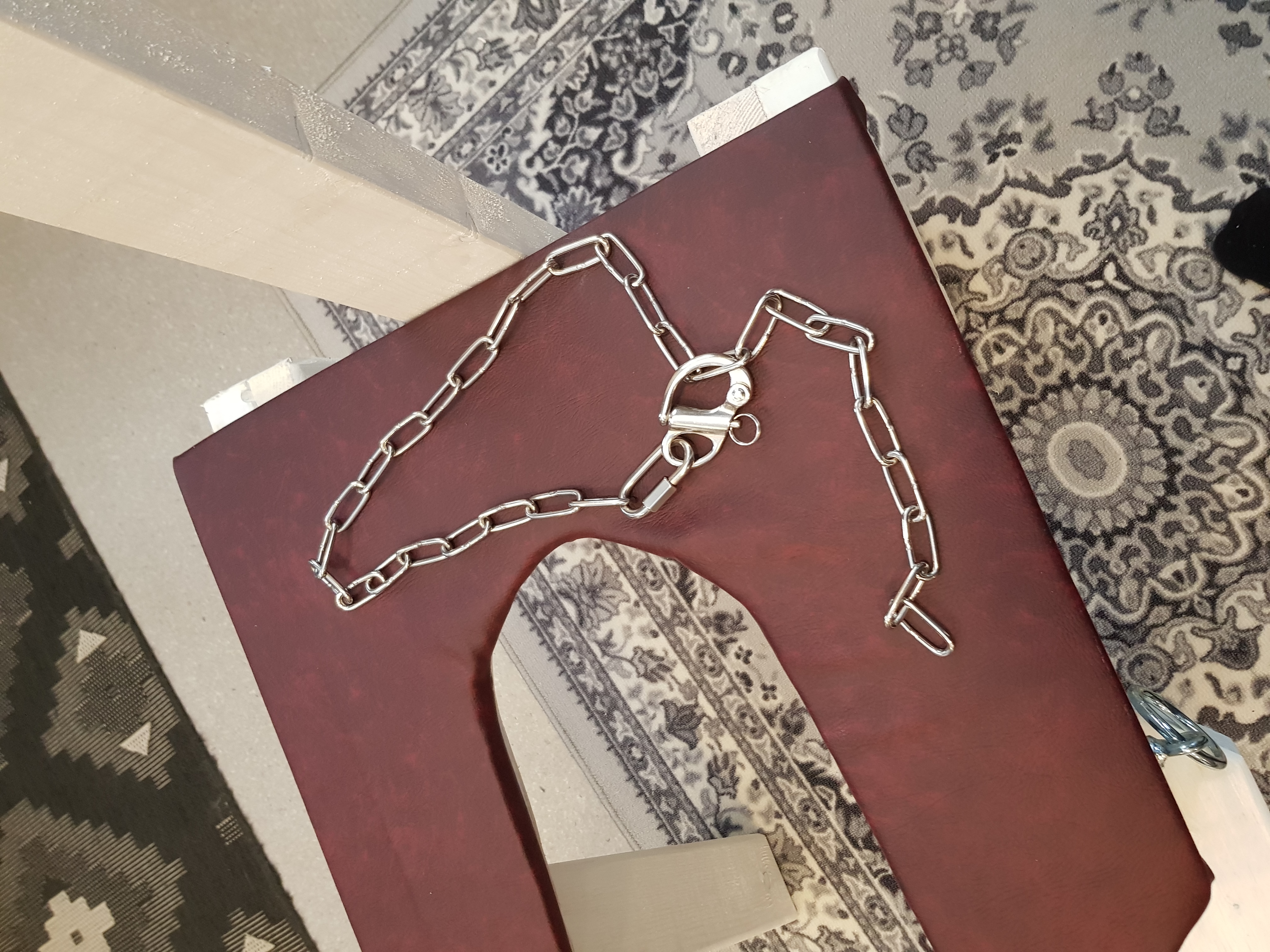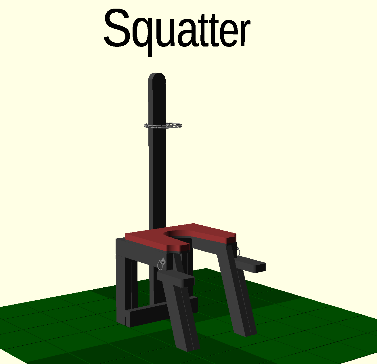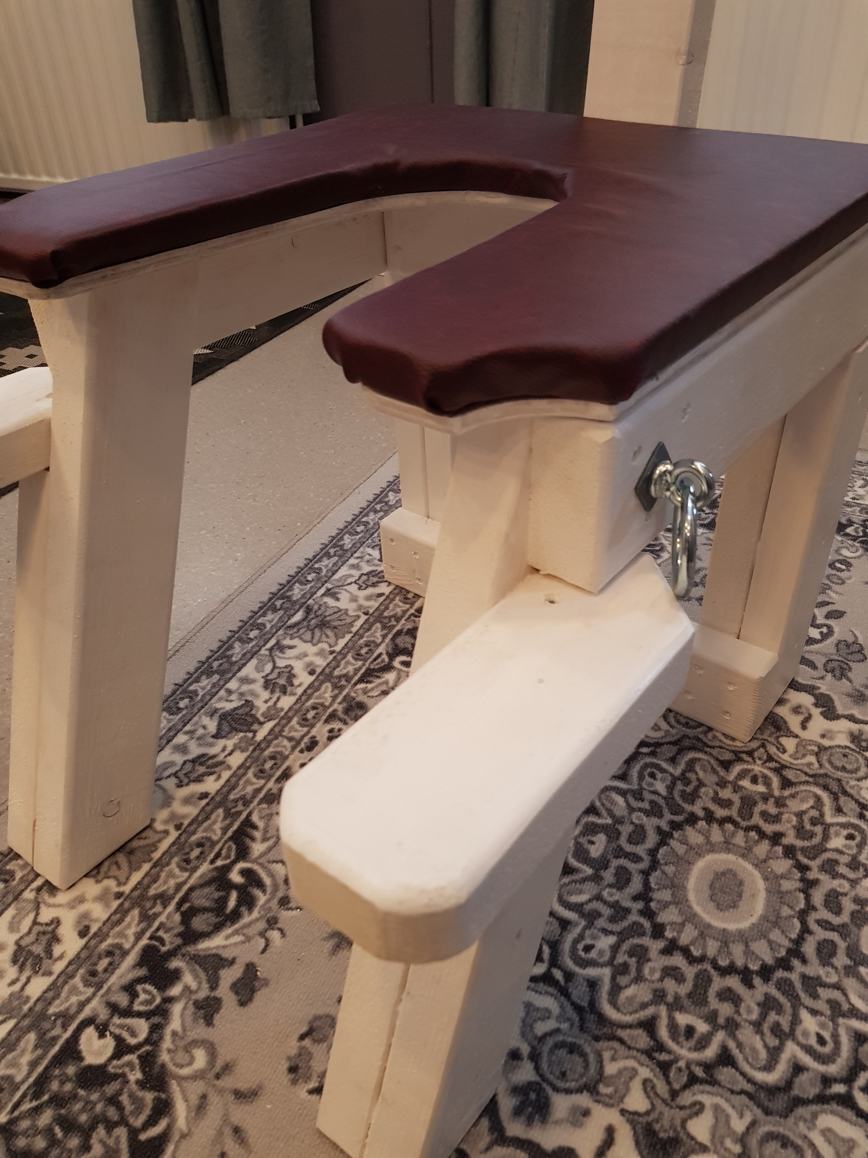 The person sits on the chair, with the feet on the foot rests, ankles locked to the rings. The hands are locked to the rings on the back, and the chain is locked around the neck and back rest. If you don't want the cahin to be around the neck, a longer chain under the arms works as well.